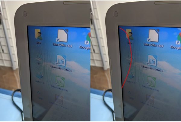 液晶モニタの左端の上部と下部に薄っすらですが、液漏れの症状が見られるので、交換させて頂くことになりました。