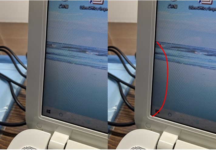 液晶モニタの左端の上部と下部に薄っすらですが、液漏れの症状が見られるので、交換させて頂くことになりました。