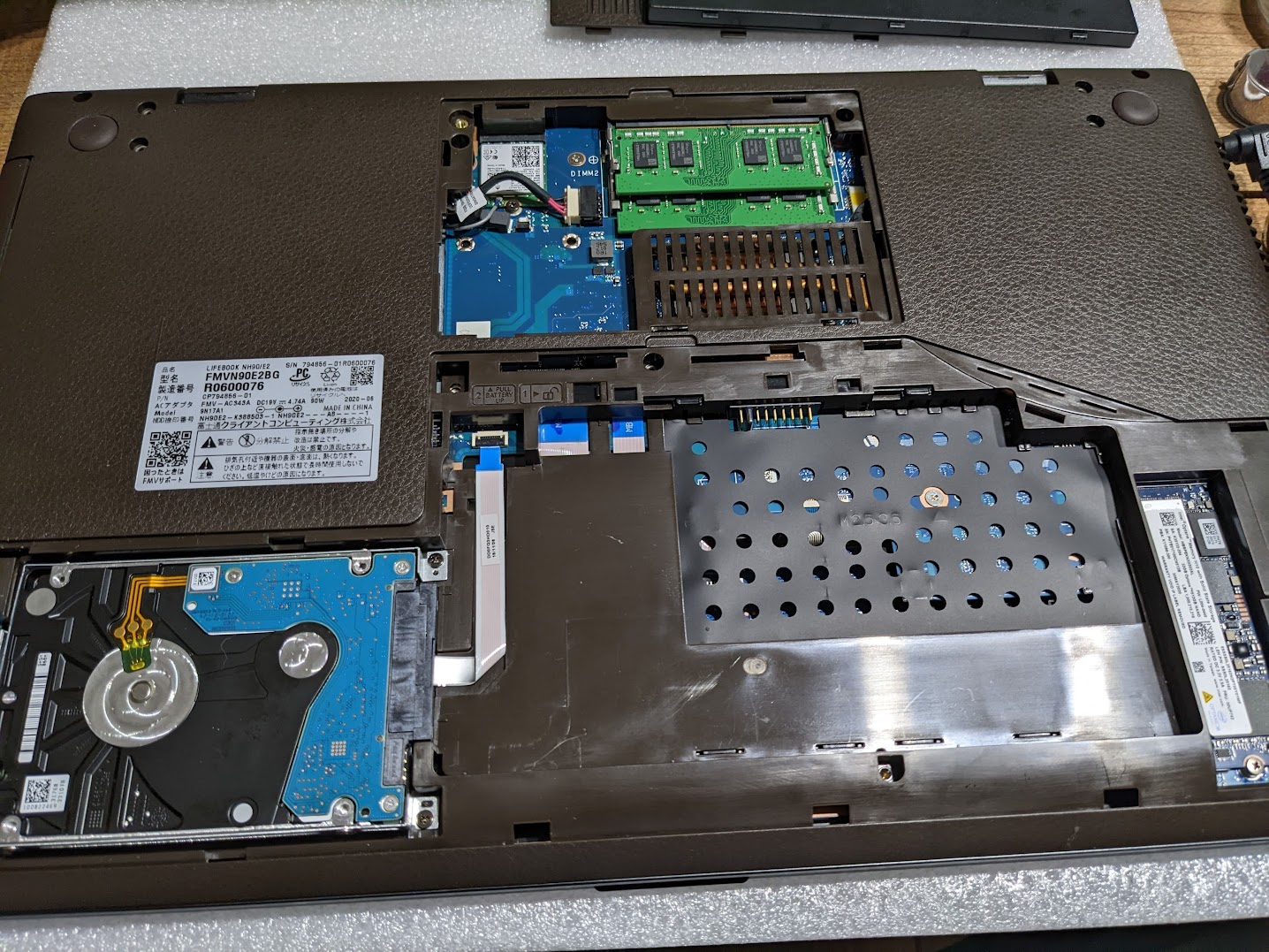 放電すると直ることがあるので、ACアダプター、バッテリー、メモリ、HDD、DVDドライブを外して、電源ボタンを長押しし、念のため1時間ほど放置しました。