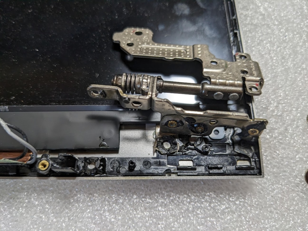 ヒンジを留めているプラスチックが破損して、液晶パネルから離れてしまっていました。