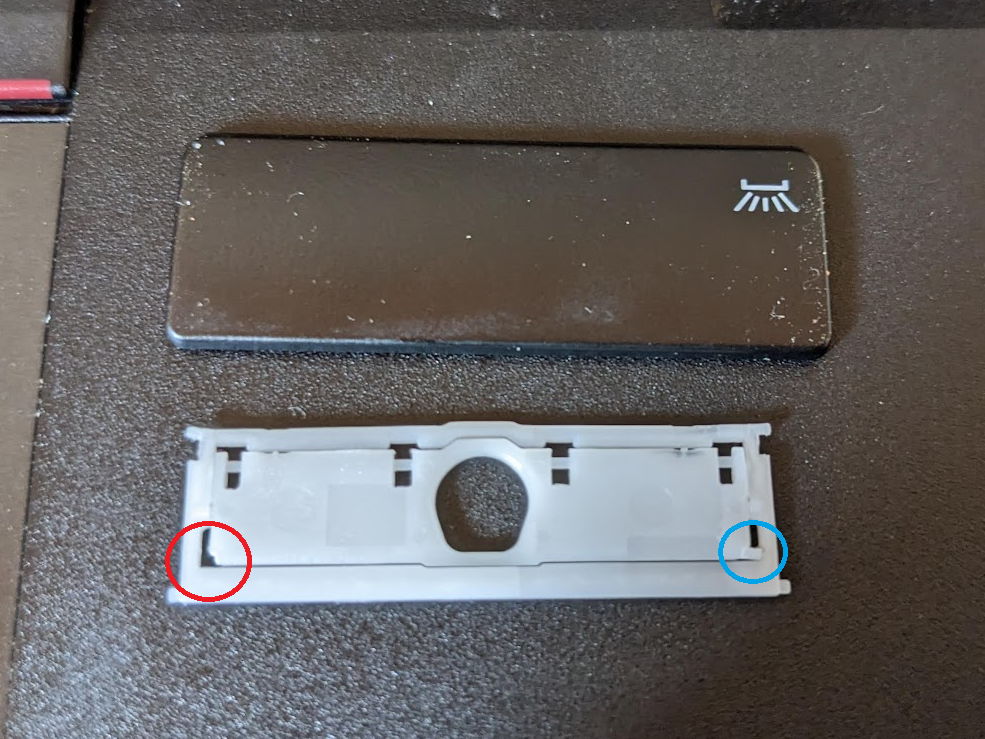 「Shift」キーと、キーの裏に付いている白いパーツを確認させて頂きましたが、白いパーツの左側赤丸の部分にあるはずの爪が折れてしまっていました。